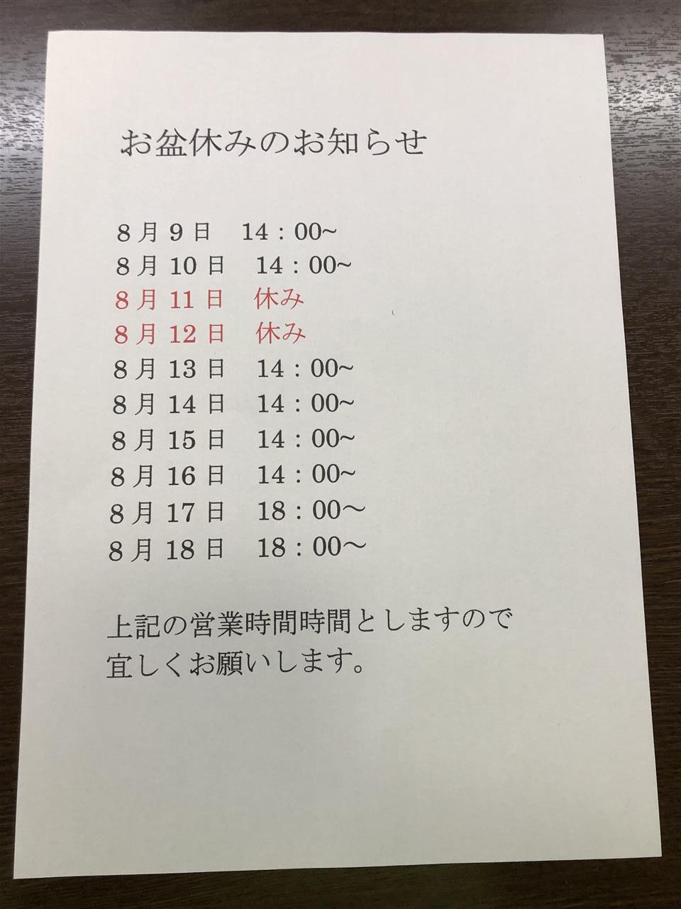 8月11.12日をお休みしますのでお願いします🙇