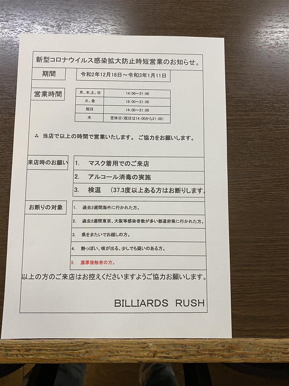 12月18日から1月11日まで時短営業にいたします。